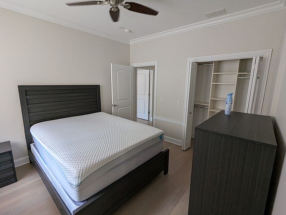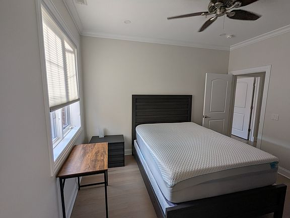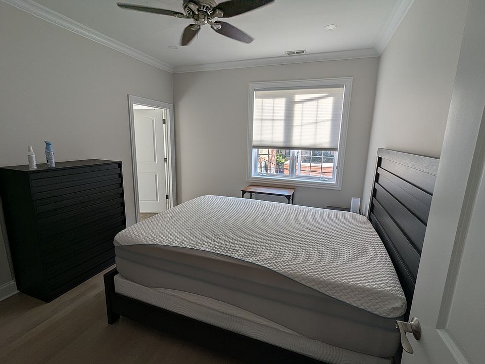 Room: 12'8" x 11'4", furnished with a nearly new large dresser, nightstand, small desk, Ikea closet organizer, and queen memory foam bed with Posturepedic topper. Attached private bathroom.