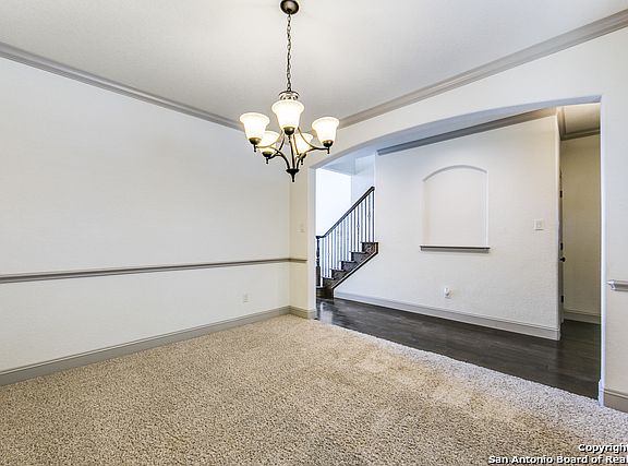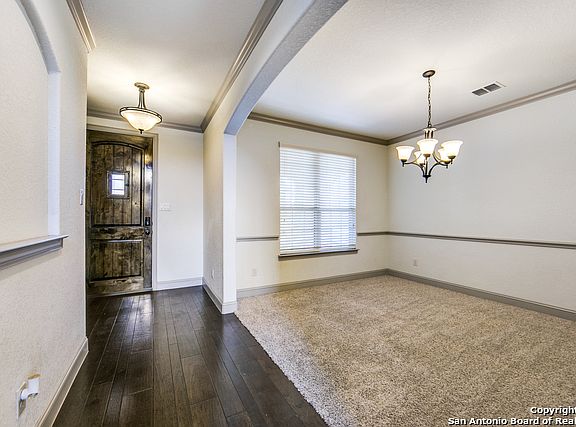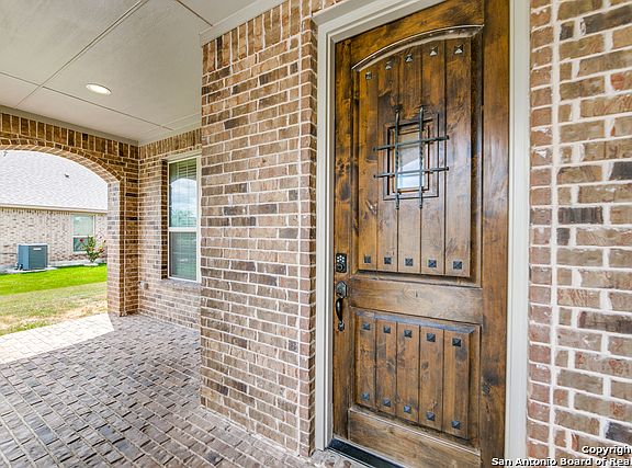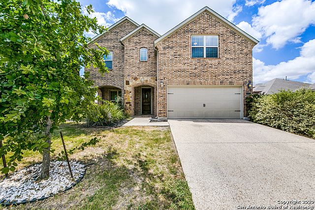Beautiful 4BR, 3.5BTH 4sided brick home in well sought out Kallison Ranch Subdivision, backs up against Government Canyon State Park. This Megatel home is built like a Custom home with 8ft front custom wood door, beautiful archways with wood flooring in entry.Foam insulation and tankless water heater. Formal dining room. High ceilings and large 20 inch diagonal tile flooring in kitchen and wet areas with accent smaller tile embedded in flooring. 42inch custom alder wood cabinets in kitchen and other areas. Large granite island. Beautiful travertine backsplash with copper accents. Family room with gas fireplace and custom mantel. 20ft ceiling height is family room with balcony viewed from main living area. Master down with on suite and walk-in closet. Gorgeous wrought iron stairrail to second floor. 3 large bedrooms up with two additional bathrooms. Very nice front porch and covered patio in back with plumbed for gas grill and expansive backyard. Northside schools and great amenities.
