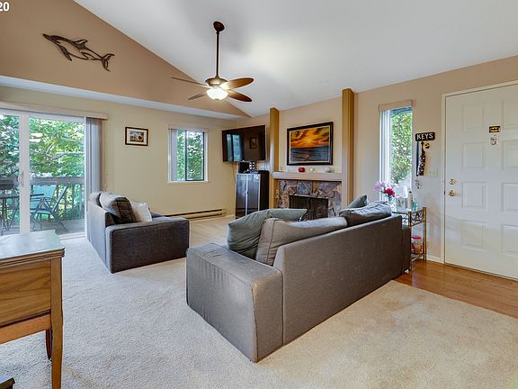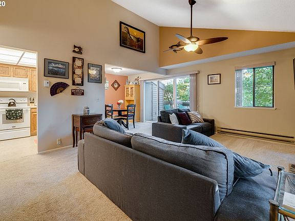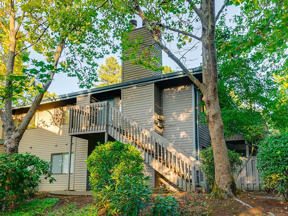 Great opportunity-upper level, end unit for a 1st time home buyer, someone downsizing (FHA/VA approved) or investment. Convenient location to Nike, shopping, bus lines, TV HWY, 217 & 26. Open living space w/U-shaped kitchen, lrg dining&living rm w/wood burning frpl & vaulted ceilings. 2 spacious bdrms, huge closets, 2 full baths-walk-in shower in mstr bath, full sized laundry room w/built ins & addit storage off private deck. Mountainside HS, pet friendly HOA & fee incl H2O, sewer & garbage!