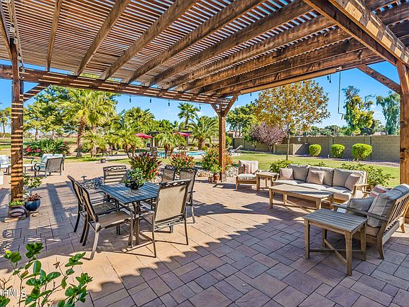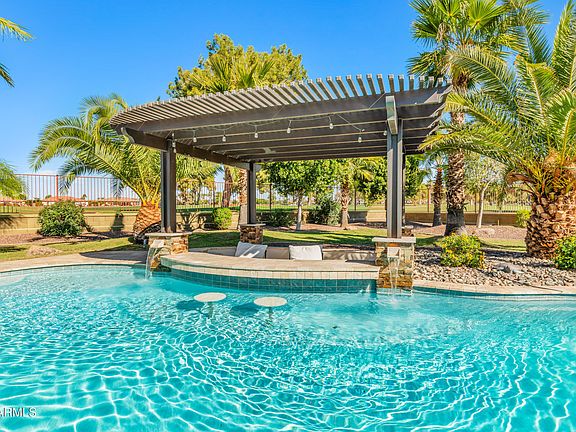 Nestled in the prestigious gated community of ''The Reserve'' in Litchfield Park on the Wigwam Golf Course, this stunning home sits on the largest lot in the neighborhood and offers 3 bedrooms, a versatile den, and 2.5 bathrooms. Beyond the private courtyard gate, you'll be greeted by soaring ceilings and an open layout designed for modern living. The gourmet kitchen boasts custom wood cabinetry, stainless steel appliances, a built-in microwave and oven, a gas cooktop, and a spacious island with barstool seating overlooking the inviting living space. An OWNED SOLAR package dramatically reduces energy costs, and recent upgrades, including new AC units, a hot water heater, fresh paint, and new carpet, make this home move-in ready. The luxurious primary suite features a custom-tiled walk-in shower, dual sink vanity, and a walk-in closet, while the guest bedrooms share a convenient Jack-and-Jill bathroom. The additional den is perfect for a home office, gym, or extra living space. Outside, the backyard is a true entertainer's paradise with a paver patio, a covered pergola, a built-in BBQ, a gas fireplace with seating, and a sparkling pool complete with a swim-up bar and sunken covered seating area. Fully landscaped with lush grass, vibrant plants, and landscape lighting, this outdoor retreat is both stunning and functional. Don't miss your chance to live the luxury lifestyle in this sought-after community!
