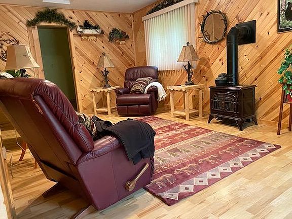 This cozy home is the perfect getaway or retirement home. 2BD, 1BA home has in floor heat plus central AC! Open concept living/dining/kitchen w/vaulted ceilings, Beautiful oak cabinets & woodwork thru out. Family rm has T&G walls. 1st floor laundry w/cabinets & utility sink. Decorative LP stove in FR. Ceramic tile floors, 200 amp electric, 24x26 detached garage, blacktop driveway, sitting on 3.01 wooded acres on quiet deadend street. Outside patio area, Home is turn key & comes fully furnished. Drilled well & conventional septic.