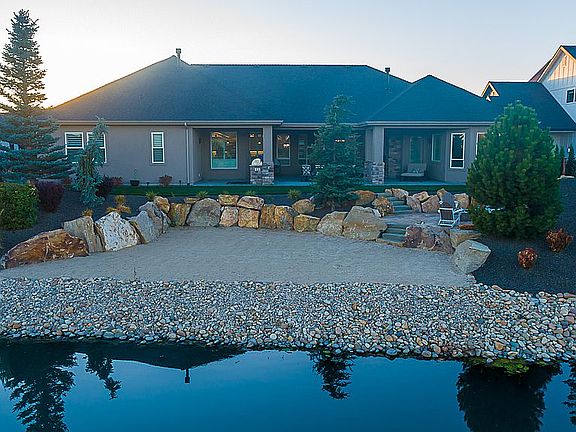 This stunning one-floor home has a Mediterranean exterior displaying Balustrades on open front exterior. There is a large back deck with an outdoor fireplace, TV & covered built-in BBQ. There is an outdoor open fire pit area that steps down to a private beach area over-looking a beautiful large pond. The large kitchen has Viking appliances, warming drawer and full-size beverage cooler.