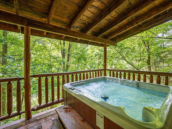 Main level plus loft layout features an open living area with an electric fireplace, a 65'' TV, and a sleeper sofa. The fully equipped kitchen has been updated with newer appliances and freshly painted cabinets. On the main level back deck you the hot tub, porch swing, and you can listen to the creek that runs along the base of the hill behind the cabin.