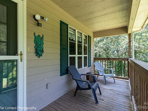 Ideal short term rental or full-time home. Can be sold fully furnished and turn-key ready. A private retreat in the WNC mountains of Haywood County - but close to town for convenience! This 3 bed home features a serene, wooded landscape with great outdoor areas. Sit on the front porch and relax to the sound of the babbling brook across the road or enjoy time with friends on the back deck. There's also a great place to sit around the fire and take in the winter mountain views! Two carports and plenty of driveway for parking. Primary on main, and laundry also on the main living level, with 2 bedrooms and another full bath upstairs. The living room is cozy with the gas fireplace. Newer laminate wood floors throughout the main level. This property is two parcels with nearly 4 acres and there are two outbuildings located on the property.