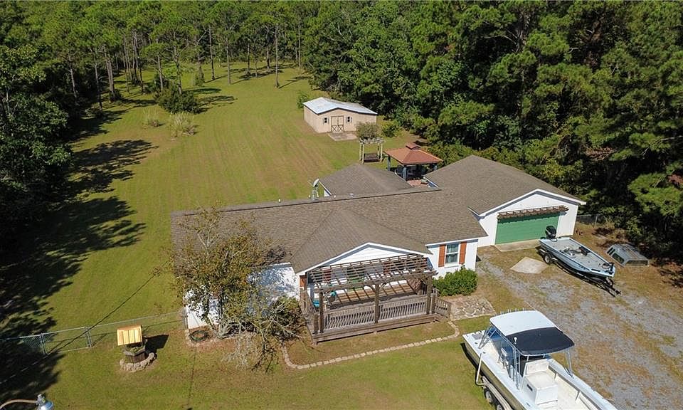 Welcome to this beautiful 3-bedroom, 2-bath home offering 1,448 sq ft of comfortable living space, just 10 minutes from the beach. Situated on almost 3 acres of mostly cleared land and in the desirable Flood Zone X, this property provides both privacy and convenience. The home features a tankless water heater, detached 2-car garage, a workshop/shed for additional storage or projects, and a charming backyard gazebo ideal for relaxing or entertaining. Being sold fully furnished, this property is move-in ready and offers endless potential as a primary residence, vacation home, or investment opportunity. Schedule your showing today!