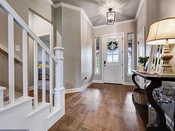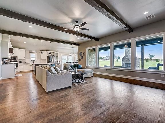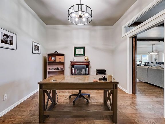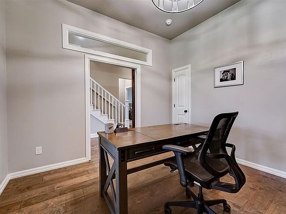 A rare opportunity to find yourself in a new single owner home in Fox Lair Estates! The prestigious Finns Point model is the most sought after design in the builder's portfolio, and the sellers elected for over $30k of upgrades. Sitting on almost an acre near the woodlands of north Edmond, this home was designed with intent. Boasting over 10' ceilings, bullnose corners, and elegant luxury finishes throughout. Upon entering you are greeted with warm chestnut brown wood grain tile floors throughout the downstairs, with new carpet in the bedrooms. Private barn door office space off of the living room with panoramic views of the backyard. Pro series kitchen with stainless steel appliances, cotton candy quartz countertops, and an oversized kitchen island that doubles as a breakfast bar. Dedicated mudroom off of the laundry room with ample storage and room for coats and boots, as well as powder bath. Primary bedroom downstairs with en suite bathroom, double vanity with soaking tub, private commode, glass enclosed shower, and massive walk in closet with ample shelving. Downstairs guest bedroom also features en suite full bath. Upstairs landing could be used as a kids play area or secondary living room. Additional bedrooms upstairs with full bath. Outdoor living room complete with fireplace to enjoy the evenings or relax under the stars. 3 car garage with side entrance, underground storm shelter, and the entire property is setup with underground sprinkler system. Paying attention to function and aesthetics, this home will exceed every expectation. Included one year home warranty to help protect your investment should you need it. Opportunities like this don't come around often, make your appointment today! *Don't forget to check out the virtual tour* ALSO AVAILABLE TO LEASE!