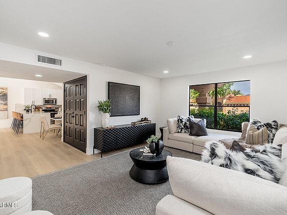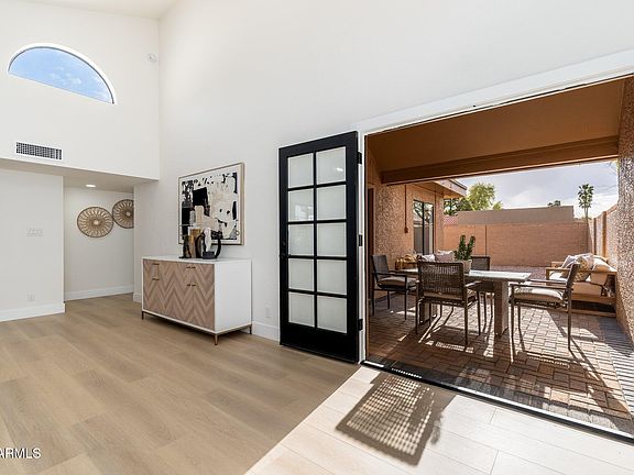 Experience luxurious living in this beautifully renovated single level end-unit townhome in the heart of desirable North Scottsdale! Featuring stainless appliances, new shaker cabinets with quartz counters throughout, the latest finishes, upgraded wood-look premium floors and recessed lighting throughout and fireplace in the family room. Primary bedroom features French doors opening to one of two new beautiful paver patios along with a fully remodeled en-suite bathroom with large tiled and glass enclosed shower and a double sink vanity. The home includes a large attached 2-car garage with direct access to the kitchen. A community pool nearby complete this tastefully remodeled, easy living masterpiece. Welcome home!