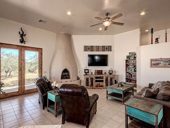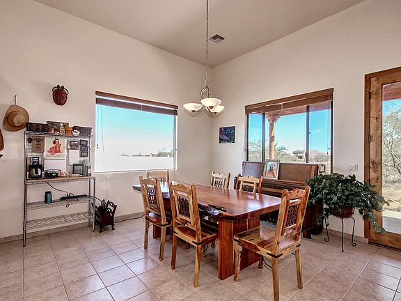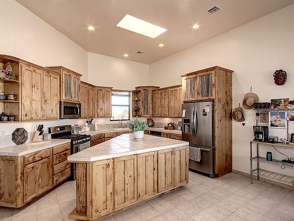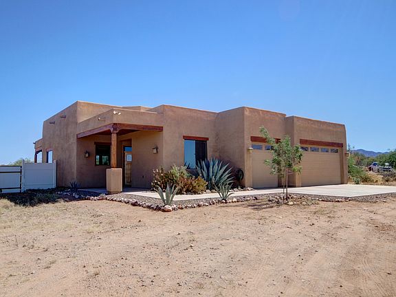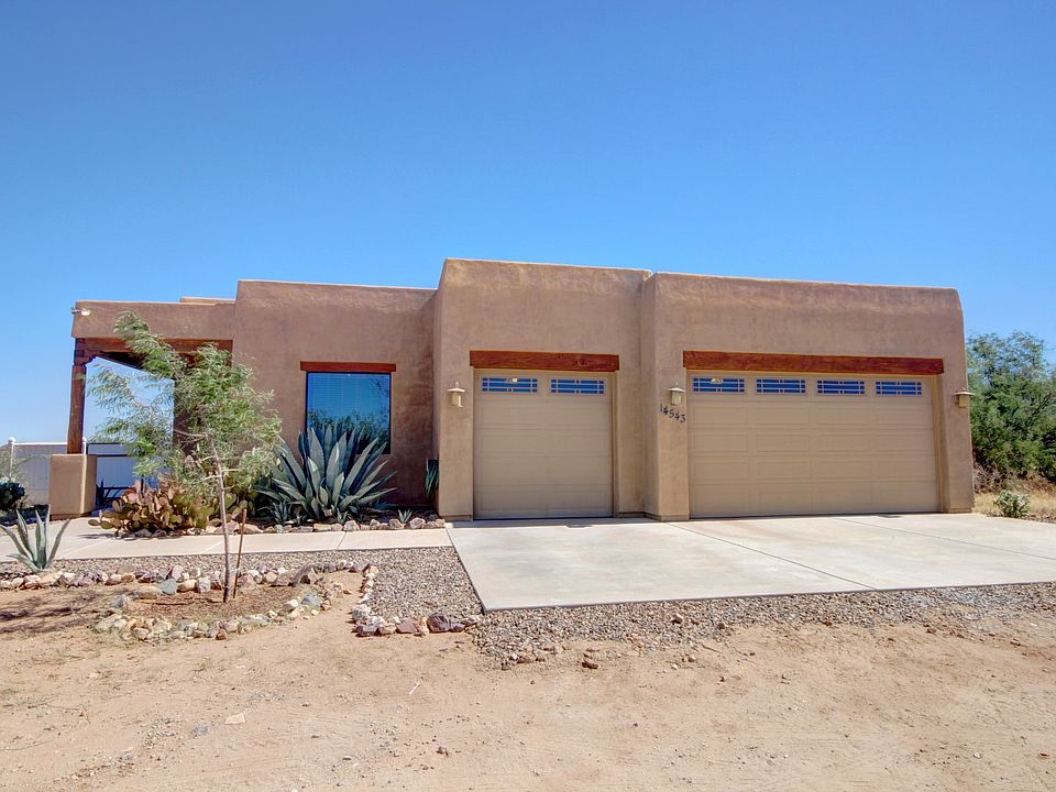 This fantastic territorial home & horse property is nestled on over an acre of land with majestic mountain and desert views. The beautiful eat-in kitchen features a large center island, tiled counters, SS appliances, and plethora of custom wood cabinetry. Vaulted ceilings, skylights, plant and decorative shelves, private den/office, ceiling fans, and beautiful tile and wood floors throughout. A cozy beehive fireplace and patio access compliment the large and open great room. Generous size bedrooms with ample closet space and jetted baths. Top it off with a huge 3 car garage that has it's own urinal and sink! Additional covered parking, storage shed/tack room and horse trail access right out of the backyard!This property is truly special!