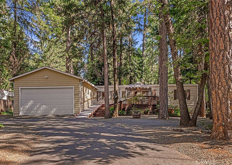 Nestled in the beautiful Magalia Pines is this 3 bedroom, 2 bath home with a detached garage on a .23 acre lot and is ready for a new owner! Nice landscape and a wonderful circle driveway welcome you and your guests to the property. The detached garage measures 20X24 and has an oversized 8ft high garage door. On the north side of the property is more than 40 ft of boat, trailer or R.V. parking. The front entertaining deck leads to the front door. This home offers the split primary floor plan. The home also offers two family rooms! A wood floor and pellet stove separate the two living areas. The dining area offers a built in hutch and a dual pane slider to the back deck and yard. The kitchen offers a 7ft. breakfast bar, built in counter range, double built in ovens, dishwasher and refrigerator. Off the kitchen is the laundry room with storage cabinets and seller is including the washer and dryer. The spacious primary bedroom offers mirror closets and the primary bath offers dual sink vanity with solid surface counters, step in shower and separate soaking tub. The guest bedrooms are also spacious and the guest bath offer solid surface vanity and step in shower. Central Heat and Air. Whole house generator hook ups. This home is ready for a new owner!