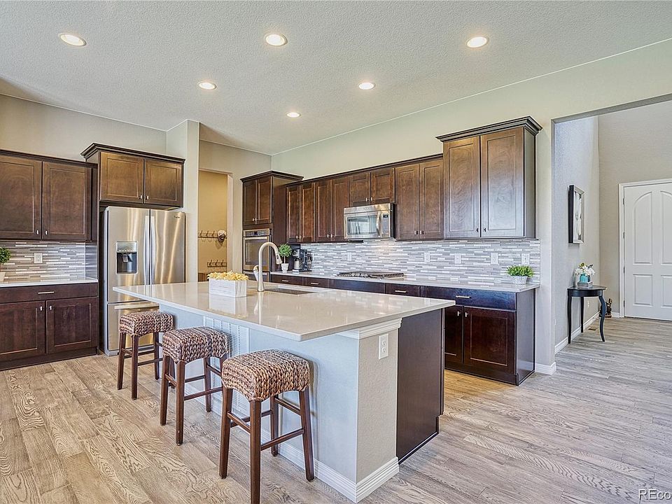 WOW! Space for everyone in this 6BR/5BA home with over 4600 finished square feet of living space! Welcome to the Heirloom Neighborhood, an extremely desirable, nearly new community with terrific access to I-25 or C-470. This home is spotless, with an abundance of natural light, a custom finished basement and backyard made for entertaining. Enter into the 2-story foyer with soaring ceilings. Chef's Kitchen features quartz counters, gas cooktop, double ovens, center island with seating space, and an incredible walk-in pantry. Kitchen opens to both a dining area as well as a large living room with gas log fireplace. You will already be entertaining with family and friends before you even see the rest of this magnificent home. Journey upstairs to find 4 bedrooms. Your private, Master bedroom retreat offers a custom barn door entrance to a 5-piece ensuite bath with double sinks, gorgeous tilework...and we can't forget the his and her closets. The second bedroom has a desirable ensuite bath. The remaining two upstairs bedrooms share an adjacent full bath. There's also a convenient main floor bedroom which can also be used as an office. The oversized finished basement has plenty of space for game and movie nights, a large rec area, gas fireplace, 6th bedroom and a three quarter bath that serves beautifully as a guest suite. Your fully fenced backyard oasis backs to open space and offers a covered patio for indoor/outdoor living, professional landscaping and kids play area. Home Extras: 2-zoned HVAC for energy efficiency. Custom Playground stays. Dog Run. 8' doors on main floor. 3 Car Garage. Front Porch. HOA includes a community pool and playground, clubhouse, trash/recycling, hiking and biking trails. You owe yourself an opportunity to live in this gorgeous home.