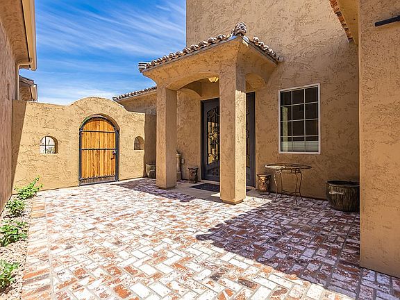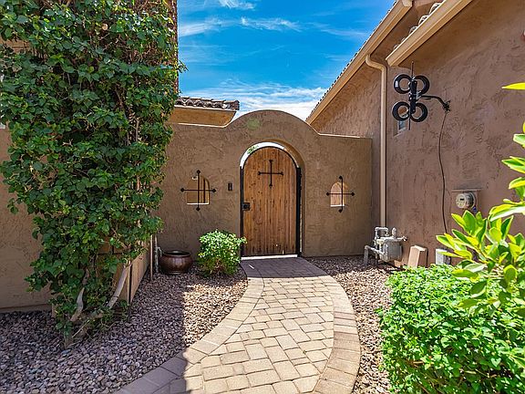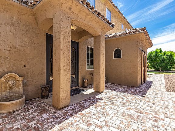 Fantastic property in Litchfield Park offers excellent curb appeal, no-fuss front yard, and 3 car garage w/paver driveway. Follow the pathway through the entry gate & access the custom iron doors to discover a welcoming foyer filled w/natural light. Ceramic tile, neutral palette, and spacious great room are features worth mention. Magazine cover kitchen includes gorgeous staggered cabinets w/crown moulding, Travertine backsplash, granite counters, SS appliances, and island w/breakfast bar. All bedrooms enjoy soft carpet, ceiling fan, and closet. Main retreat boasts private balcony,and lavish ensuite w/dual vanity, make-up table, soaking tub, and walk-in closet. Bedroom downstairs owns a private bath. Contemplate the golf course from your lush backyard w/relaxing pond. Must see this value!