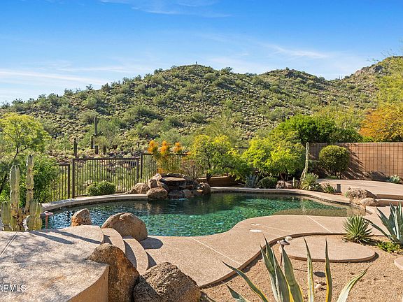 Located in the exclusive private gated Hidden Hills community, this home offers a serene drive in, backing to the mountain preserve, and easy access to the Sunrise Trailhead. Enjoy great natural light and mountain views from the primary suite, living room, kitchen, and backyard. High ceilings enhance a split floor plan with a primary suite featuring a spacious walk-in closet, plus 3 guest bedrooms, 4.5 bathrooms, an office/flex space, formal dining, and an entertainer's kitchen with dual ovens, a beverage bar, and a dining nook. Low-maintenance desert landscaping, recent interior and exterior paint, and RO + water softener systems add convenience. Close to top public schools, Scottsdale BASIS, the Sunrise Trailhead, and Mayo Clinic, this home blends privacy, views, and an ideal location.