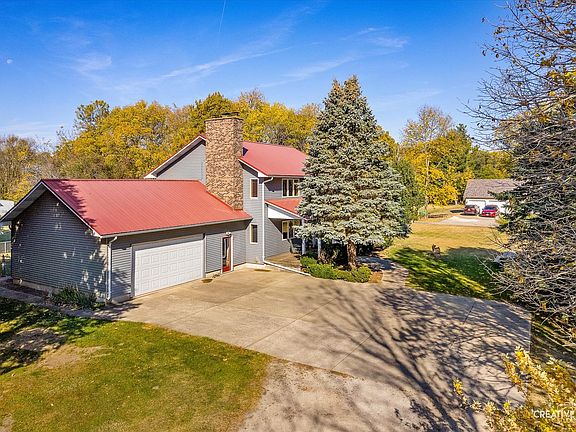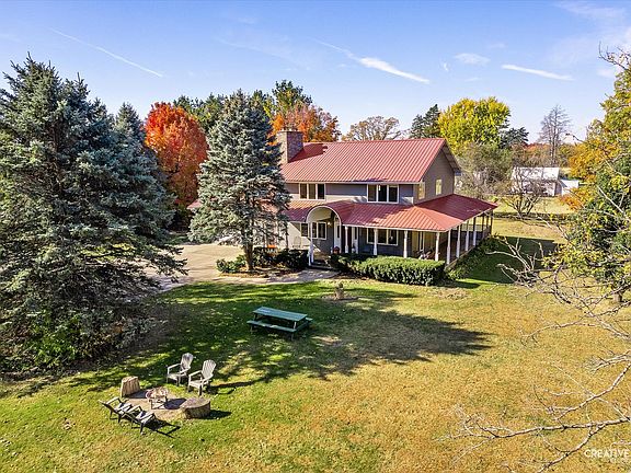 This is it!  Custom built one-owner home sitting on .69 acre lot w/ an additional .69 lot included offering a total lot size of 1.38 acres ( 2 pins)! Possibilities are endless!  The massive wrap around covered porch offers 900 sq ft of outdoor space! The welcoming foyer opens to the fantastic living room w/ full wall masonry fireplace and den featuring antique leaded glass doors. The open kitchen w/ lots of custom Schmidt cabinetry features pullout shelves, appliance garage, all appliances, and island for additional seating! Great Dining area w/ sliders open to massive porch and 20x27 dog run! First floor laundry! 2nd Floor features massive primary suite w/ built ins and private bath, 2 more bedrooms and a full bath! Basement offers a workshop, tons of additional space just waiting for your touches, and great walk up access to garage. The 25x32 garage is ready for your projects!!! Private Well and Septic! Metal Roof! Anderson Windows! Home Warranty Available! Great for Commuters, Metra 20 min away! Don't miss this one!