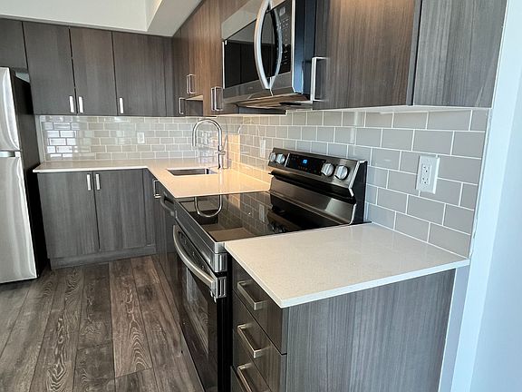 Stunning modern condoView of lake ontarioNatural lightWide plank floorsStainless steel appliancesSparkling quartz counterSubway tile backsplash