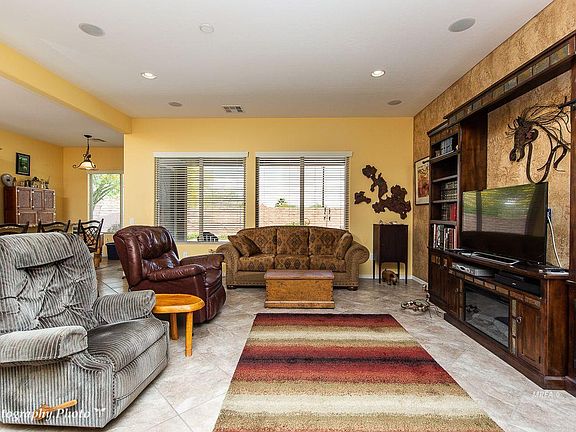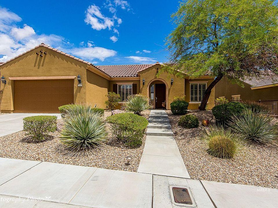 This beautiful Marigold home is located on a quiet cul-de-sac in the tasteful Reunion Valley Village of Sun City Mesquite. Bright and Open Floor Plan with great Mountain Views. Along with 2 Primary/Owner bedrooms, 2 full bathrooms and a 3rd bedroom/office/den, there are upgrades galore, including plantation shutters, Great Room surround sound, custom paint throughout, extended 18" square tile diagonally set and upgraded carpet and pad. Kitchen under cabinet lighting adds ambiance to the granite counter tops, upgraded cabinets and upgraded appliances. Kitchen has an R/O system. Soft water extends throughout the home, the bathrooms feature a cultured Marble tub and Shower and Comfort Height Toilets. Save on energy bills with the Brand New highly efficient 3-Zone heating & air conditioning unit. New Insulated Garage Door. You will appreciate the privacy of your backyard with mountain views and a low maintenance desert landscaped yard. Concrete Pad and 220V power for future hot tub. SIDS PAID IN FULL. Click the Blue Unbranded Tour Link for Video Walk Through.