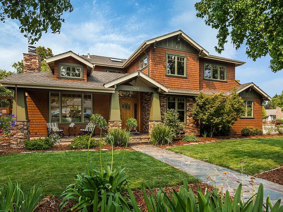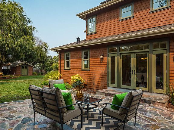 Gorgeous Craftsman set on large, beautiful corner lot offering 5 bedrooms, 4 baths, and 3-car garage plus 5-off street parking spaces. This Craftsman has fabulous details throughout: oak floors, exceptional woodwork, high detailed ceilings, and lots of natural light. Front porch has sitting area with a leaded-glass front door. Open floor plan; living room w/fireplace, formal dining room w/outdoor access to a large slate patio, kitchen-family room w/ wood-burning fireplace and access to delightful backyard. Kitchen is u-shaped with island, all with granite tops, plus high-end stainless-steel appliances, 6-ft. fridge/freezer, Viking gas range and 2nd electric oven. The 5-BRs include a primary suite w/walk-in closet, spa-champagne tub, step-in shower, additional BR-suite, 2 other bedrooms share a full bath. The 5th-BR provides a combo office/guest room with cherry wood built-ins. Laundry-room has sink, chute & lots of storage. Backyard has shed, storage corral, and spacious garden area.