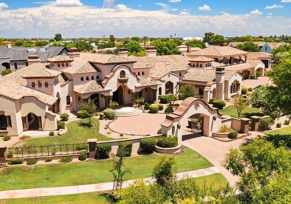 Situated on 1.7+ acres in the exclusive, gated community of Legacy Estates, this meticulously crafted custom estate offers an entertainer's idyllic resort-style living experience. The privately gated, manicured grounds provide a 12' deep diving pool, lazy river, play pool, multiple water features/fountains/slides, a heated spa, gas fire pits, an outdoor kitchen with a pizza oven, grill, built-in BBQ's, Wok Range, Yoder smoker & room to lounge under the covered patios/ramada/pergola! Expansive open floor plan presents custom ceilings throughout, an executive office, media room, game room, junior suite, a 6-car overheight garage + workshop, secluded primary suite, fitness room, it's own private patio & much more! The custom kitchen is equipped with alder wood cabinets, granite countertops - Viking stainless steel appliances, an oversized center island & 2 extra-large pantries accompanied by a beautiful breakfast nook & elegant formal dining space. Enjoy separate garage entry to the 2-level guest casita with a ground level in-law suite, 2nd level bedroom, living room, fully equipped kitchen & private balcony. Enhanced with custom wood beamed & venetian plaster ceilings, intricate woodwork, oversized windows, soaring ceilings, Cantera stone fireplaces & phenomenal handcrafted details, this residence is truly one of a kind.