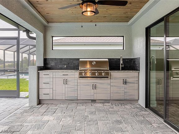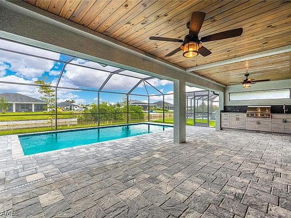 Discover this new construction, waterfront gem in Southwest FL that stands a step above the rest. $10,000 buyer closing cost assistance! An exquisite four-bedroom home with pool, designed for both luxury and cost-efficiency. The home features energy-efficient amenities, fully paid city utilities at closing, and no required flood insurance. It all begins with a tongue and groove wood ceiling entry. In the primary bedroom, there are tray ceilings, a large walk-in closet, and sliding glass doors providing access to the pool. The primary bath includes dual vanity sinks and a large tiled shower with glass enclosure. The custom Shaker-style kitchen boasts soft-close doors/drawers, granite countertops, a large island, tile backsplash, upgraded stainless appliances, and a 3 YEAR appliance warranty. The living room features a coffered ceiling with decorative beams, a shiplap feature wall, and recessed wall media boxes. Experience the convenience of living near some of the best attractions in Cape. This home is ideally situated just around the corner from the Wicked Dolphin Rum Distillery, Farmer Joe’s—a family-owned, farmer's market-style grocery store—popular restaurants, gyms, and more. You'll also have quick access to Matlacha, celebrated as "The Cutest Artsiest Fishingest Town in Florida" and "A Funky Slice of Old Florida." The interior features an open floor plan with tile throughout, complemented by a Proflex 90 crack suppression barrier. Large bedrooms offer ample closet space, enhanced by upgraded 5¼” base moldings, 7¼ windowsills, and trim cap base, and two-panel Shaker-style interior and exterior doors. The exterior includes a large pool with a paver patio, screen enclosure, outdoor shower, and a summer kitchen equipped with a grill and sink. Additional highlights include a paver driveway, walkway, and large patio, architectural shingles with Polyglass self-adhered underlayment, storm shutters on all windows, impact-resistant double front doors, and an insulated recessed panel hurricane garage door. The custom coastal design features a three-tone exterior paint color scheme and tongue and groove exterior ceilings. A programmable irrigation system and Floratam sod landscaping enhance the curb appeal. This home is built with energy efficiency in mind, featuring foam-filled concrete block walls, blower door results of 2-3 ACH, significantly better than the builder standard of 5-7 ACH. The conditioned attic space with R19 spray foam enhances the life expectancy and performance of the AC unit and ductwork. The R14 upgraded exterior wall insulation is nearly four times builder standard. Additional energy-efficient features include Low E dual pane tinted insulated glass windows, LED bulbs in all fixtures, ceiling fans in all bedrooms, the family room, and the patio, a 3-ton 16 SEER AC unit with programmable thermostat, and energy-efficient appliances. For a comprehensive list of the exclusive upgrades unique to this home, more details can be provided.