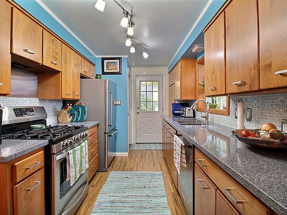 Vacant, easy to show! Precious home on a large corner lot, complete with a spacious chicken coop. Oversized garage with 350 sq ft studio/separate space with kitchen and bath. Versatile space for home office, home classroom, inlaws quarters, nanny quarters, or artist studio. Updated kitchen with stainless steel appliances, quartz countertops. Wood floors and gas fireplace make this home so cozy. Newer roof, siding/paint and furnace. Basement recently finished. Downstairs bedroom is non-conforming