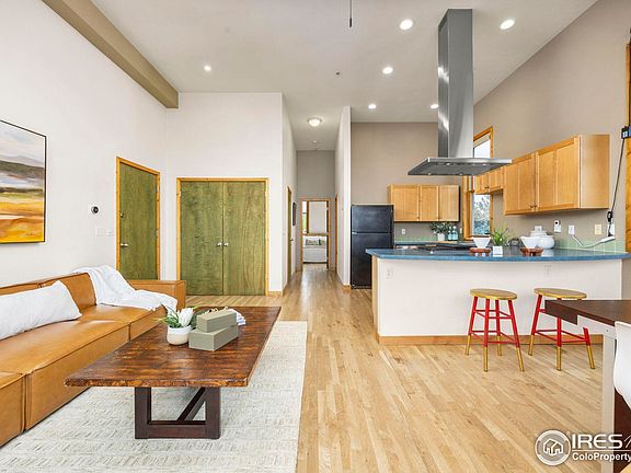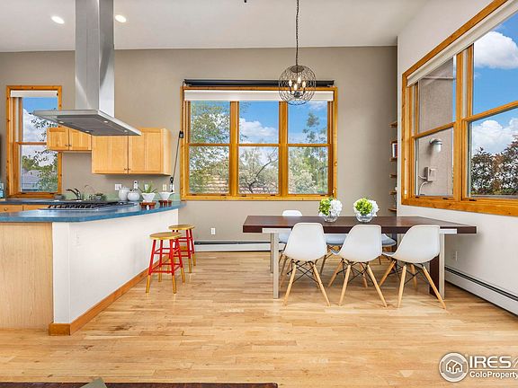Welcome to this beautifully designed corner condo in North Boulder's sought-after Holiday neighborhood. A rare opportunity to enjoy elevated style, panoramic views, and exceptional walkable convenience. Inside, soaring 12-foot ceilings and expansive walls of windows fill the home with natural light while framing breathtaking views of the Flatirons and foothills. The open-concept great room showcases rich hardwood floors and seamless flow between the living, dining, and kitchen areas, with direct access to a private balcony for morning coffee or evening sunsets. The thoughtfully designed kitchen features generous cabinetry, a peninsula for casual dining, and a gas range that blends form and function. The spacious bedroom retreat includes dramatic windows, space for a home office, and a custom walk-in closet with abundant storage. Everyday living is elevated by thoughtful enhancements such as a dual-sink vanity, in-unit laundry, energy-efficient mini-split heating and cooling, and a projector with an electric dropdown screen for cozy movie nights. An exterior storage locker adds convenience for outdoor gear or seasonal items, keeping your interior clutter-free. The location is truly exceptional. Just steps from beloved neighborhood favorites including Amante Coffee, Moxie Bread Co., Spruce Confections, Proto's Pizza, and Bacco Trattoria, plus miles of trails, Holiday Park, and easy access to shopping and daily amenities. This home offers a perfect blend of style, comfort, and quintessential Boulder living. Don't miss the chance to make it yours. Schedule your private tour today. OPEN HOUSE SAT from 1PM-3PM
