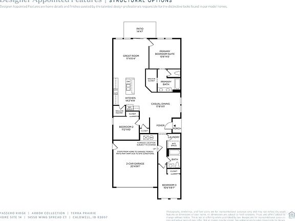 The Terra's design features a thoughtful flow and wonderful spaces for gathering and relaxing. A welcoming foyer reveals a sizable casual dining area with lovely views to the expansive great room and desirable rear patio, perfect for entertaining. Completing the well-appointed kitchen is an oversized center island with breakfast bar, plenty of counter and cabinet space, and a roomy walk-in pantry. The gorgeous primary bedroom suite is enhanced by a spacious walk-in closet and an alluring primary bath with a dual-sink vanity, a large luxe shower, and a private water closet. The secondary bedrooms feature ample closets and a shared hall bath. Additional highlights include easily accessible laundry and plenty of additional storage. Front and rear landscape included. BTVAI
