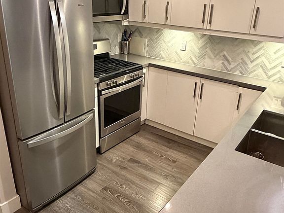 Walk out patioHuge yardWide plank laminate flooringStainless steel appliancesModern cabinetryQuartz counter topsUndermount sinks