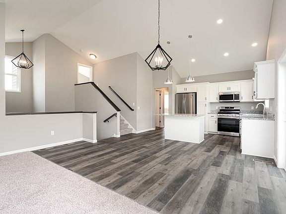 **This gorgeous home features not ONE, but TWO FLEX ROOMS-one on each level! This beautiful Newport floor plan with a 3-car garage has an open concept with vaulted ceiling, LVP throughout main living level, granite countertops, ceramic tile kitchen backsplash, floor to ceiling stone fireplace in main living area/great room. One of the highlights of this home is the large and luxurious master bedroom suite which is set apart from the other 2 bedrooms on the main level and the vaulted ceiling makes the suite even more spacious-includes large walk in closet and master bathroom with double sinks and oversize shower. Downstairs, 2 additional bedrooms and a bathroom along with a large family room & separate flex room gives plenty of space for everyone to hang out together or separately, whether working from home or playing at home. Sod and inground sprinkler are included.