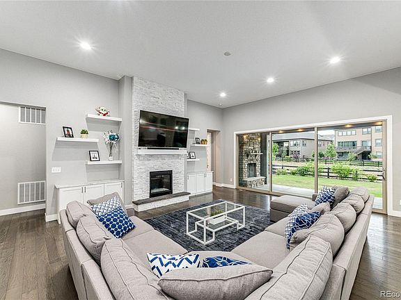 Wow! The moment you walk in the front door of this south facing 4 bedroom, 4 bath ranch style home backing to Open Space, you will want to kick your shoes off and call it home*Extensive hardwood floors throughout main level*Open Gourmet Kitchen that features a large kitchen island, Quartz counters, 42" cabinets with crown molding and soft close drawers/cabinets, stainless steel appliances all included, 5 burner gas range, double ovens, dishwasher, refrigerator, and microwave. Breakfast nook surrounded by windows*Kitchen is open to spacious family room with high ceilings, light and bright with gas fireplace and white stone surround*Main Floor Study/Formal Dining Room, with built-in cabinetry*Massive 18 Foot slider opens fully to covered patio with gas fireplace perfect Colorado Indoor/Outdoor Living with beautiful sunset views plus a motorized sun shade to keep you warm or cool depending on the season*Master Suite featuring 5 Piece Master Bath with large soaking tub, glass surround shower, dual vanities, Quartz countertops, and Large Walk-In Closet*Guest suite on main level is adjacent to full bath*Professionally finished basement featuring large recreation room, TV area with built-in cabinetry, large bar with sink, quartz counters, mini fridge and wine fridge, 2 additional bedrooms both with walk-in closets, and 3/4 bathroom*Large storage room in basement*Mudroom off of garage with built-in cabinets and shoe storage*Main level laundry with cabinets and utility sink*Walking distance to pool and clubhouse*Minutes to Reuter-Hess Challenge Incline*Easy access to 1-25, downtown Parker, Castle Pines, Lone Tree and trails*