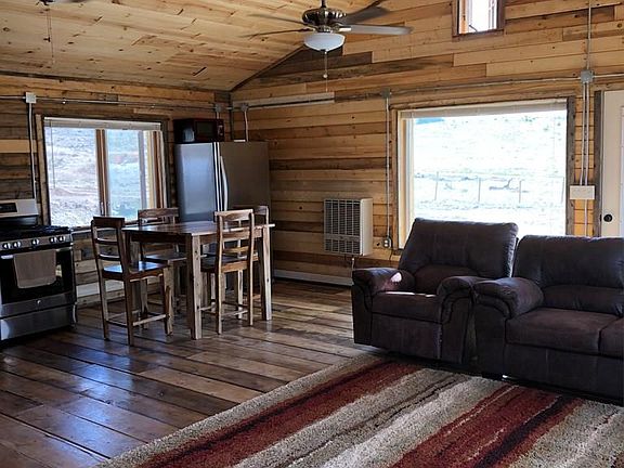 Immaculate newly finished home with stunning views from every room. Home is built with rustic style and comes fully furnished. Beautifully finished with individual heat in each room for efficiency. 40x60 Barn/ shop has 200 amp electrical panel, and has water.. The mountain views form this home are amazing. Property is fully fenced for animals. Low traffic area as it is the second to the last house on the street. If you are looking for a wonderful mountain view property that can be on or off the grid this is the property for you.