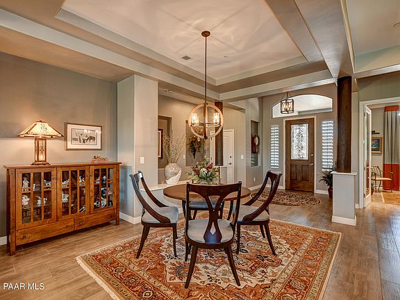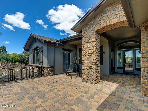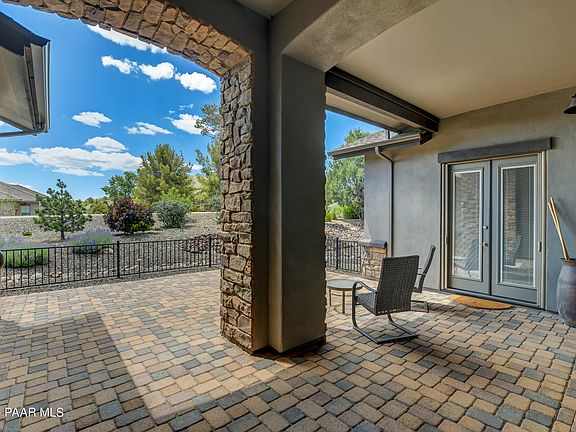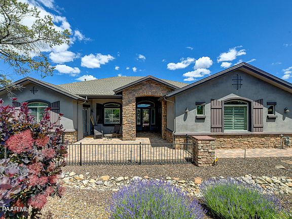 Opportunity to live in a highly-custom 2017 Carrington home with the finest luxury upgrades, golf course frontage, and VIEWS. Located in the sought-after gated Estates neighborhood within the gorgeous master planned community of Prescott Lakes. This single level stunner offers 2837sqft, with 3 BRs, den, 3 BAs, and an open split bedroom floorplan that is ideal for a primary, vacation, or weekend home. Fabulous chef's kitchen with Wolf gas range, Sub-Zero fridge, and large center island to complement the gorgeous custom cabinetry. Two dining areas, spacious but cozy living room with gas fireplace, and inviting outdoor living areas with a back covered patio with firepit, grill and additional designer firepit, and steps to a lower flagstone landing - perfect for a cocktail and star gazing!