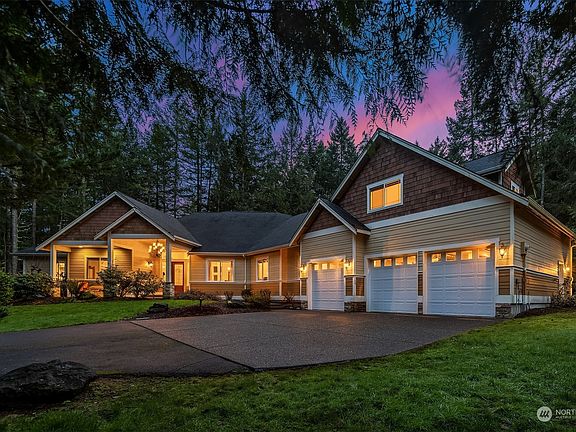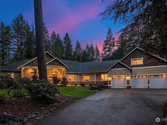PNW PARADISE ~ Ooh La La! Situated down a long gated drive, this sprawling 3,771sf 5 bed 3.5 bath luxury rambler privately set on a 2.27 acre wooded wonderland feels like your own park! Grand-scale layout features 10' ceilings, oversized windows, oak hardwoods & opulent finishes throughout. Soaring covered front porch & glamorous foyer with dual chandeliers set the stage. Living & family rooms with cathedral ceilings & full-height fireplaces. Chef's kitchen with Viking appliances, dining island & butlers pantry. Sumptuous primary with covered deck & lavish ensuite. MIL apartment with separate entry. Sweeping patios, sports court & HUGE 1,000+sf shop with loft & 2nd driveway. Just minutes to parks, beaches, ferry rides & Olalla Bay Landing!