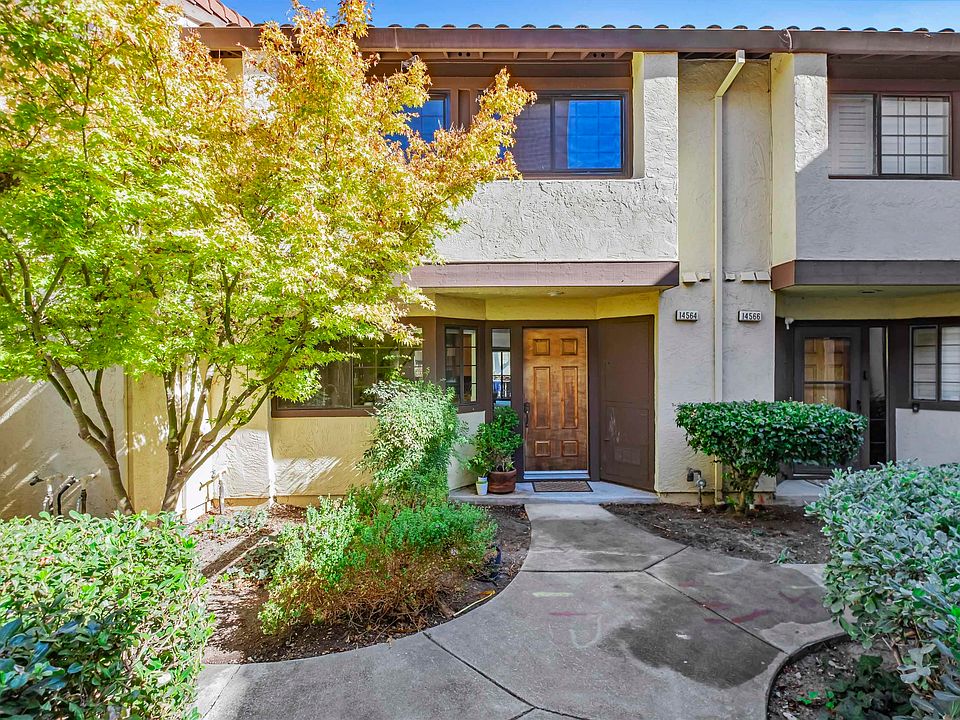 ALL NEW AND REPLACED SINCE 2021: stainless steel refrigerator, dishwasher, gas range and stove with lighted vent hood; new washer/dryer combo in a dedicated laundry closet, and a new water heater. ALSO: BRAND NEW TOP OF THE LINE CUSTOM MADE DOUBLE PANE GLASS PATIO DOORS BOTH UPSTAIRS AND DOWNSTAIRS, new custom double pane windows in the second and third bedrooms as well - these doors and windows are fully warrantied for 20 years and cut your energy bills significantly. Besides all the upgrades, you have two private garages for parking or storage, upstairs and downstairs patios, as well as a very large, lovely and well maintained garden that runs the length of the entire property, perfect for walks or letting your kids explore. Near the front of the property is a very nice and well kept pool, hot tub and dry sauna for use by the residents only, and at the rear of the property is another in ground hot tub and dry sauna. HOA covers water and garbage, as well as exterior painting and roof maintenance! Grab this great deal in an extremely quiet, park like setting, gated for safety. Walking distance to the golf course, the beautiful San Leandro Marina, as well as restaurants and grocery stores.