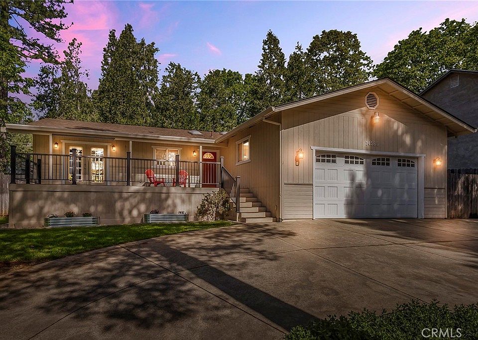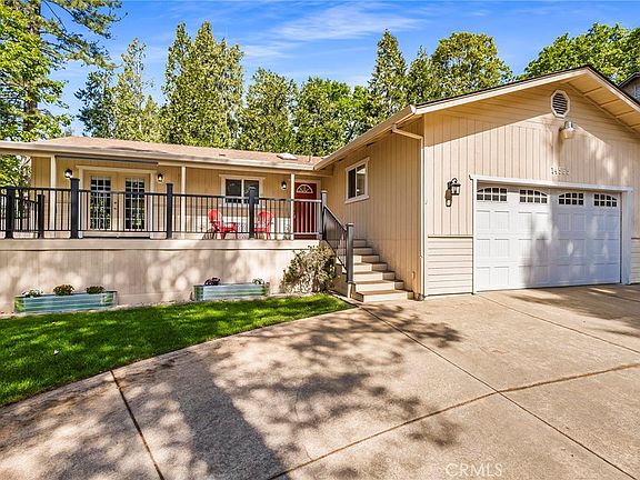 Tranquil move-in ready 3 bedroom, 2 bathroom home nestled in the pines of Magalia! This property features a huge circular driveway with easy access and ample parking, a new trex deck off the front of the house offering an ideal setting to start or end your day under the serenity of the Evergreens. Gorgeous solid oak hardwood flooring greets you in the entryway and kitchen, newer laminate flooring throughout the living areas. You'll love the recently updated kitchen with new countertops, gorgeous farm style sink, beautifully painted cabinets and all new appliances. Additional features include vaulted ceilings in the living room, French doors that open from the dining area to the peaceful front deck, to the abundance of light from the skylights throughout the house. The bright cozy sunroom off the living area includes a freestanding wood stove and access to a patio area with wiring and space for a hot tub. The bedrooms are all well sized and the primary suite has a huge walk in closet as well as access to the sunroom. Brand new roof from 2022, septic clearance as well as an oversized 660 sq ft. garage with a workshop area and plenty of storage including a loft area. The front yard has ample grass for pets, lovely flower boxes and Cherry as well as an Asian Pear tree. The fully fenced backyard includes about 14' of boat or trailer parking. Make your appointment today to see this amazing tranquil home in the Paradise Pines Home Owners Association which includes all their amenities including amazing hiking and biking trails situated right in front of this peaceful, well maintained home.