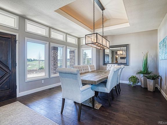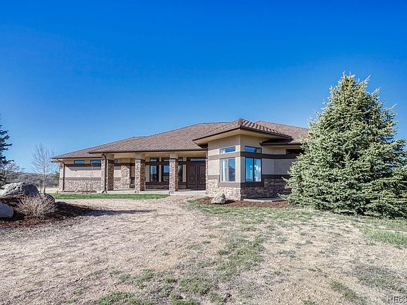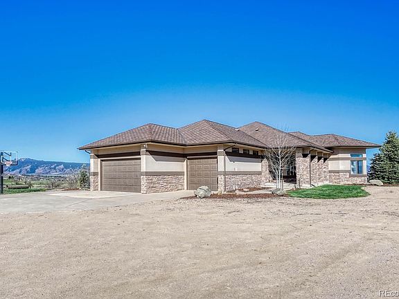 Impressive ranch property on 19.38 acres perched on top of a hill with unbelievable sweeping mountain views! An exquisitely detailed wood door guides you into the foyer, where stone walls meet beautiful wood floors and designer lighting accents. The coffered ceiling in the dining and family rooms add a nice architectural touch. Off the dining room you'll locate the recently remodeled kitchen with white shaker cabinets, quartz countertops, and endless mountain views. The kitchen opens to the living room where the main focal point is the fireplace surrounded by beautiful stone. The main floor master offers a wall of windows, a walkout entry to the deck and a 5 piece bath. Step outside and enjoy entertaining on the wrap around deck while taking in the stunning views from the property. The finished walkout basement has a large great room with 3 additional bedrooms and 2 bathrooms. The 1440 sq ft farm utility building is perfect for storing any equipment you may need and it has a concrete floor with radiant heat plumbing. This property has two fenced paddocks for horses. This is a must see ranch property in Castle Rock with an excellent location close to downtown castle rock and I -25.