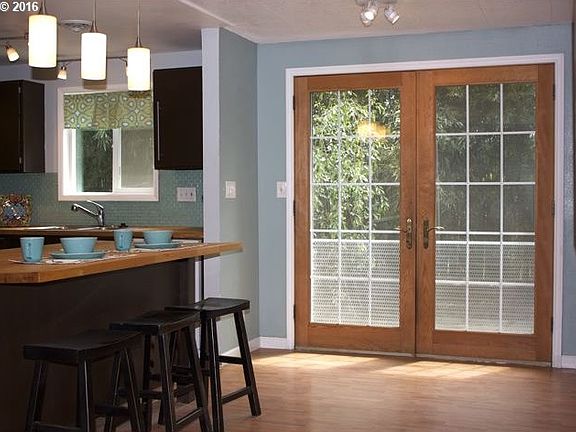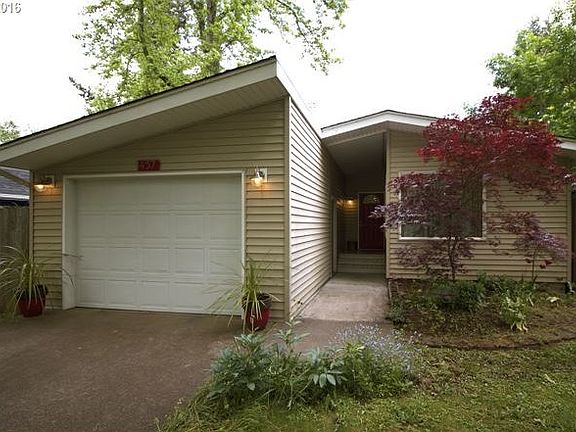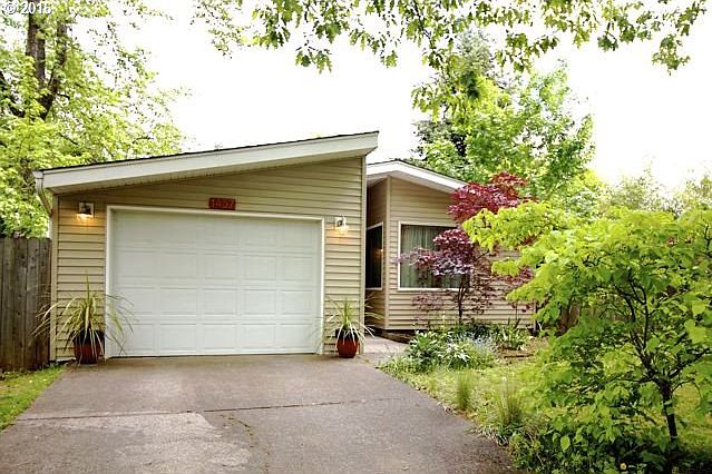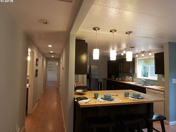 Midcentury modern charmer in West Eugene. Large master has updated full bath with deep, jetted soaking tub. Two additional bedrooms plus 2nd updated full bath. Spacious updated kitchen features gas range, fridge, island/breakfast bar, glass tile backsplash, butcher-block counters. Open floor plan with wood-burning fireplace. Two separate W/D hookups; interior hookup could be wet bar. Charming fenced patio. 2 outbuildings. New roof 1/16.