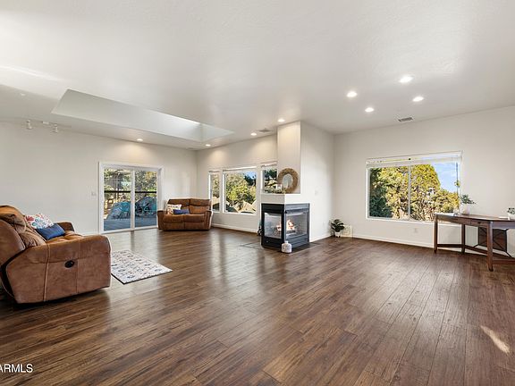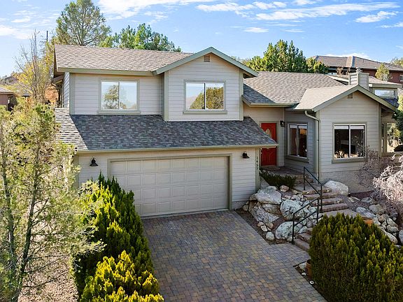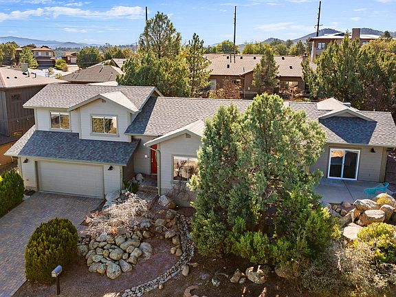 This updated 3 bd./2.5 Ba. home offers a perfect blend of comfort & natural beauty, an ideal place to call home. Set among trees & boulders, offering views of Thumb Butte. The heart of home is the living room w/a double-sided fireplace for cozy ambiance. The beautifully updated kitchen is a true highlight, featuring sleek quartz countertops, stainless steel appliances & ample cabinetry for all your culinary needs. The master suite is a serene retreat, stunning en-suite bathroom features a wonderful soaking tub, separate shower & updated double vanities. Two additional bedrooms are spacious & share an updated full bathroom with modern fixtures and finishes. The backyard is truly a highlight, featuring a pizza oven & chicken coop, this outdoor space is designed for ultimate enjoyment.