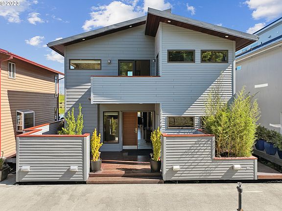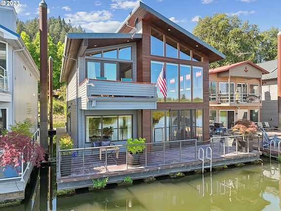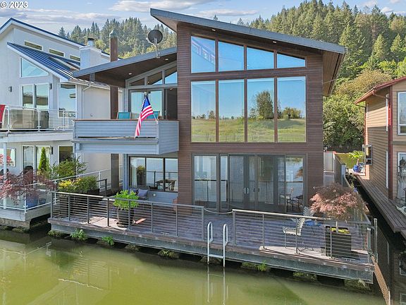 Stunning, custom, one of a kind floating home built by an Architect with a smart floor plan and situated in a fantastic, coveted moorage! A wall of windows 20 feet high with remote control blinds greet you with incredible views of the river then across to Sauvie Island. A must see. There's extensive use of unique wood from the floor to the ceilings. The dining room ceiling is Red Meranti Mahogany and Maple, the entire deck, lower siding facing the river and ceiling in office is also Red Mahogany. The amazing office has built-ins, desk w/custom wood cabinets that enhances the enviable views. High end chefs kitchen with stainless steel appliances, gas stove, built in convection oven, wine chiller makes cooking a delight while enjoying the river views out the back deck. The primary bedroom suite is a WOW! From the custom woods to its spacious room with views from the balcony to the river and walk-in closet. Its light filled bathroom hosts travertine tile, a jetted tub and heated floors. The second bedroom has two generous closets and a door to the bathroom. The float was inspected in July 2023 and is rated a top 5 for its craftsmanship construction with steel I-beam stringers and will be a benefit for decades to come. The floating home also includes TWO - 2 car garages each w/ 250sf, w/windows and space above = 500 square ft for storage, studio, hobby shop or office. You own both sides of the concrete walkway w/room to moor your boat. The moorage has 6+ acres of beautifully landscaped grounds and an artfully placed area to store a boat trailer. You are allowed two pets. Proximity to Sauvie Island - the Jewel of Portland with farms, produce, fruit, flower stands, public beaches available to enjoy. The Sauvie Island Wildlife Area is a state game area containing more than 12,000 acres for mixed use including; fishing, canoeing, kayaking, birdwatching and hiking. This moorage is in peaceful, country setting yet just 20 minutes to Portland's Alphabet and Pearl Districts.