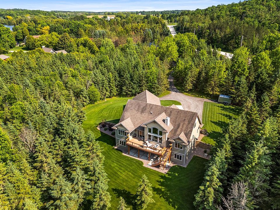 Beautiful custom home near Cedar Lake offering privacy and wooded views. This 3 bed, 3 bath home features an open-concept layout with a two-story living room, gas fireplace, and loft. The kitchen includes granite counters, wet bar, wine fridge, and eat-in dining. Primary suite has a walk-in closet and private deck access. Walkout lower level with 8' ceilings, in-floor heat, and is roughed in for a 4th bath. First-floor laundry, large closets, and 3-car insulated/drywalled garage with attic storage and basement access. Includes 200-amp service, water softener, iron curtain, and air exchange system.
