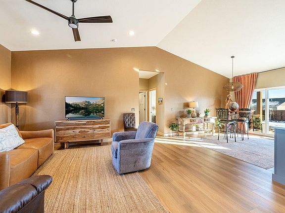 Open-concept interiorWindow treatments throughoutStainless steel appliancesVaulted ceilingsQuartz countertops