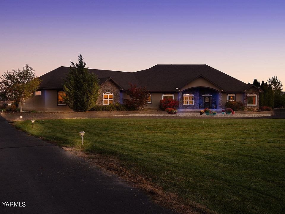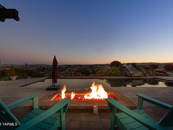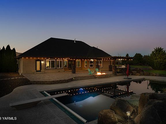 A spectacular custom home built by Mark Stevenson on a 6.02-acre retreat with sweeping postcard-perfect views in practically every direction including Mount Adams, this is a sight that must be seen. Wait a moment for your iron gate to open to gain access to your serene property and walk up to your covered front porch and step inside your home. Prepare to be mesmerized as your open-concept 3,750 square foot sanctuary begins with solid maple hardwood floors in the living room which flow into the gourmet kitchen boasting double ovens, dual-zone dishwasher, tile counter tops, and bar-style seating.This gem continues with 14-foot soaring ceilings throughout the living room area, a tile wrapped fireplace in the living room, natural light pouring through numerous large windows, and a primary suite with double insulated sound resistant walls, dual walk-in-closets, a cozy fireplace, and a spa-like bathroom containing a dual-headed shower with an additional rainfall as well, a jetted bathtub, double sinks, and access to the backyard deck area. Continue your tour to observe a second suite on the opposite side of the home with its own 3/4 bathroom and walk-in closet as well.Now, take a walk outside to observe your freshly painted home exterior and outdoor kitchen including a barbecue, refrigerator, additional storage, and gazebo above for your enjoyment. Be sure not to miss the built-in firepit as you see your glimmering 20x50 foot gunite in-ground swimming pool with a waterslide and diving board to complete your exquisite living experience.Additional features include an office with French doors near the living room, a bonus room upstairs, full laundry room with utility sink, indoor terrarium with heat and water, Yakima Tieton irrigation, an extra-deep 1,630 square foot finished 4 or more vehicle garage with three large bay doors, two water heaters, CAT5 wired and ready for smart home behind drywall along with being plumbed for a central vacuum...