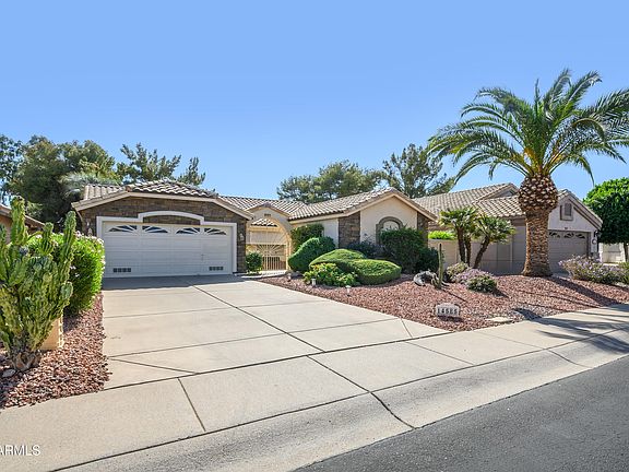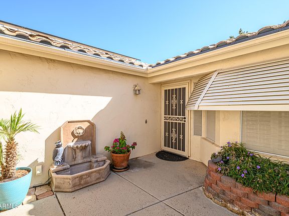 Check out this beautiful home in Sun Village a gated, walled, guarded 24x 7 community! Lake views from your screened Patio w/misting system & Extended covered patio., East back exposure and backed to common area. This home has stone accents at the front, 300 sq ft casita for guests, Gated Private Courtyard, and Courtyard Fountain. Enter to Vaulted Ceilings, Shutters, Tile on the diagonal and 6 Panel Doors. The kitchen has Quartz countertops. Stainless high end Appliances. The inside laundry has front load Washer & Dryer, Wash Sink and cabinets. The garage has a door to side yard and built in cabinets. You don't want to miss out on this beautiful home.