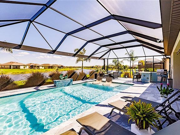 GORGEOUS POOL HOME W/MANY UPGRADES + STUNNING LAKE/SUNSET VIEWS! Smart home feat. 4 bedrooms incl. spacious Owner’s suite, 3 full baths + 3 car garage. Perfect floor plan for family living and entertaining! Large open kitchen w/island + bar, granite countertops, breakfast nook. Separate formal dining area. Great Room w/tall glass sliding doors extends to the covered lanai. Lots of improvements, incl. impact glass front door insert, whole house water filtration system, epoxy garage floor, generator access wiring/outlet in garage + more. Beautiful custom saltwater pool + w/sun shelf, electric heater. Travertine/marble decking, screen enclosure w/large picture window for unobstructed lake + nature views. Custom outdoor kitchen/bar. Value of all improvements is over $160k! Owner would also sell furniture (separately), list of furniture worth approx. $50k available upon request. NO DAMAGE FROM HURRICANE IAN. NO FLOOD INSURANCE REQUIRED! Portico is a gated community w/Low HOA fees. Amenities include clubhouse, community pool, gym, yoga/exercise room, tennis, pickleball, basketball, play area. Pets, Fences & LSVs permitted! Great location, short drive to I-75, shopping, dining & more!