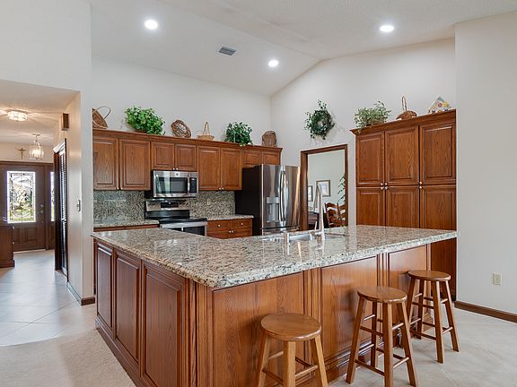 Meticulously maintained 3/2 with oversized heated screened pool in quiet neighborhood of Sugar Pond. Volume ceilings, open kitchen with stainless appliances and granite counters. Split bedroom floorplan, separate laundry with sink and storage cabinets. Updated master bathroom has deep bubbler tub with separate shower. 2nd updated bathroom features double sinks and door separating shower. IMPACT windows and doors throughout with gorgeous custom plantation shutter window treatments. LOTS of updating! Central vacuum system, roof installed 2016, pool resurfaced 2021, rescreened pool enclosure 2021, A/C 2018, garage door 2019, garage has pull down stairs to attic and exterior garage door code access, Huge 16x32 heated salt water pool with fantastic area for entertaining!!