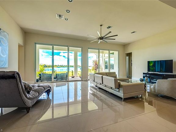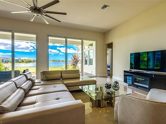Exquisite lakefront property by Ashton Woods featuring the spacious 4 bedroom/3.5 bath Majorca Floor Plan. Open kitchen and living room overlook a 125 acre private lake and provide stunning sunset views. Numerous upgrades to include 10 foot six-panel sliding doors, extended lanai with 12 foot ceilings, two master suite walk-in closets, 23.5 inch porcelain tile and upgraded carpet, large utility room with amazing built-in cabinet space, upgraded cabinets, solid wood interior doors. Other notable features include impact windows/door in the front of the home and fabric storm panels for the backside/side of the home. This exclusive gated community boasts of endless amenities including the new Island Club with its tiki bar café, resort-style pool, fitness center, lakeside beach and a private Kontiki Island. 22 lakes and nature preserves make this community breathtaking. Additionally, the community provides 2 dog parks, tennis/pickleball, 2 Duffy electric boats, kayaks, SUP boards, bicycles, aqua-bikes, a playground and community garden.