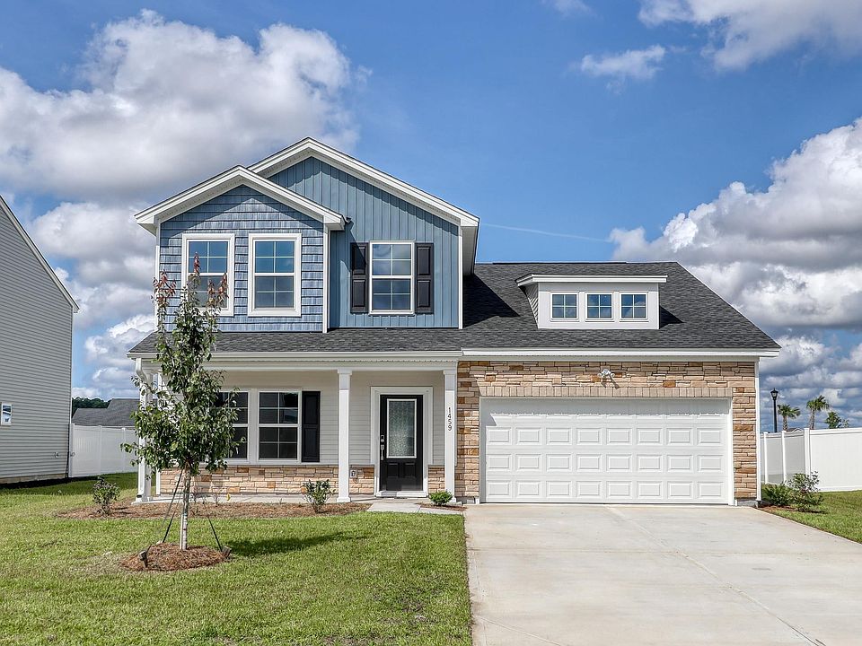 The Pickens is a four bedroom, two-and one-half bath plan with the primary bedroom on the main floor. The kitchen has gray cabinetry, granite countertops, tile backsplash, gas range and overlooks the large eat-in area and great room with a gas fireplace. The primary suite features a vaulted ceiling, walk-in closet, double vanity with quartz countertops, and a tile shower. Luxury vinyl runs throughout the main living areas including the office. All secondary bedrooms are on the second floor as well as a huge storage area and a loft with walk-in closet. Relax outside under your covered porch with ceiling fan. Irrigation, garage door opener, architectural shingles are included! Merrill Villas is located in Carolina Forest with easy access to shopping, dining, entertainment, and an award-winning school district. Ten minutes to the beach! Photos are of a completed home for representation only. Home is move-in ready!