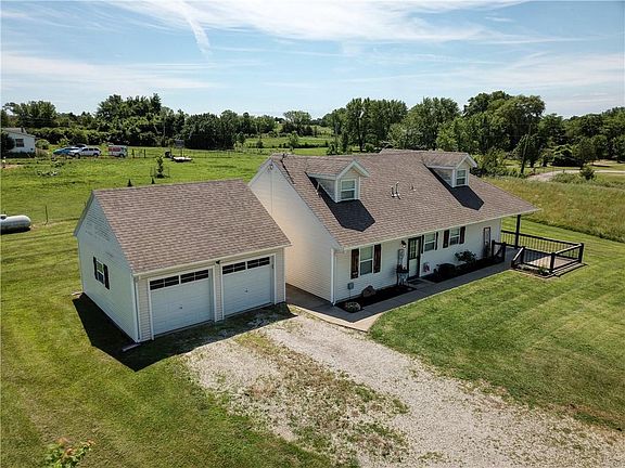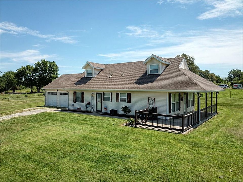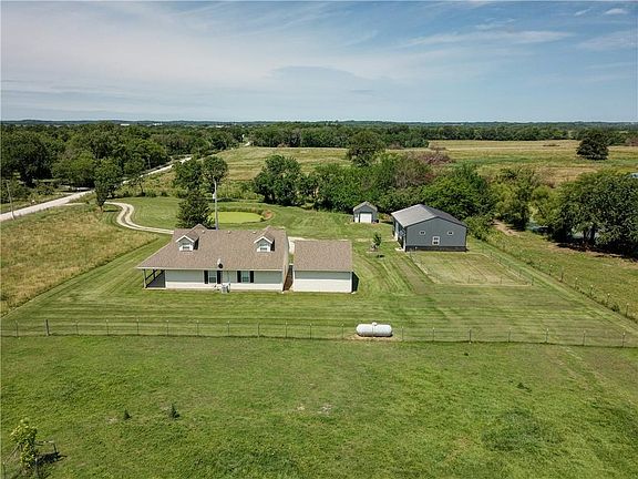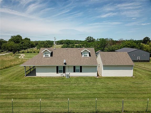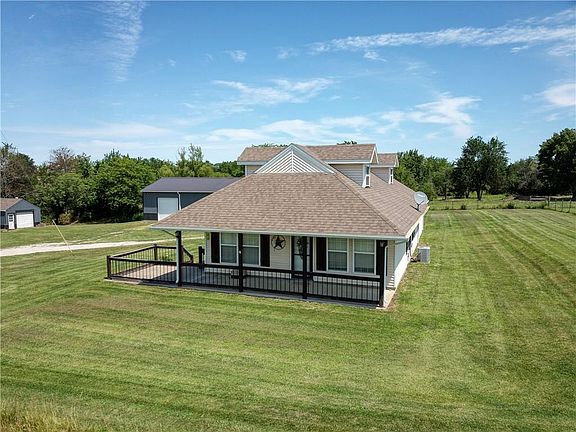 **Improved Price!!**Sellers are offering a one year home warranty up to $600 with accepted offer! This country oasis is calling your name! This prime location is just minutes to Hwy 50 for an easy 30-minute commute to Lee's Summit or Whiteman AFB. This peaceful property is just over 2.5 acres with an insulated 30' x 40' shop with radiant heat floor, wiring for 220 amp, 9' 8" X 10' roll-up garage door, loft storage, and stubbed for bath. Fenced area connects off the shop for animals. An additional shed has electric run to it but not currently functional. The story and a 1/2 home is truly move-in ready and updated beautifully! As you enter the side of the home, the drop zone showcases a bench, coat hooks, and storage with the washer and dryer opposite. The first floor Bedrooms and full Bathroom are just around the corner from the entry. The larger Bedroom could be used as a Primary with double closets, one with a built-in closet storage system. Down the hallway leads to the spacious Living Room with laminate wood-look flooring and a custom-built electric fireplace. Front door access leads from the Living Room to the covered front porch that runs the length of the home. There is a generous entryway from the Living Room into the bright, well-appointed Kitchen and Dining area. White cabinetry is accented by a stone backsplash, concrete countertops, stainless-steel appliances (all stay including the refrigerator), and extra storage in the corner pantry. Head upstairs to the second Bathroom with updated fixtures and fully tiled shower. The current Primary Bedroom is spacious with double closets and sliding barn doors. The last Bedroom is beautifully updated with LVP flooring, new paint and custom mural wall. The detached, 2 car garage also allows for more storage. Make this beautiful property a priority to see in person! (*Agents, please see Showing Agent Info for more important details)