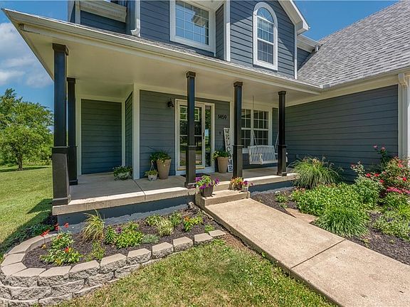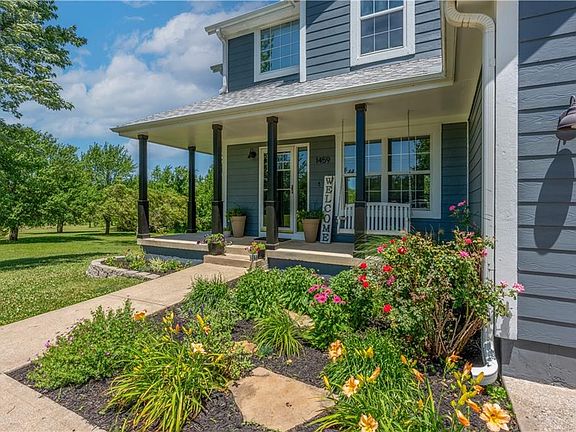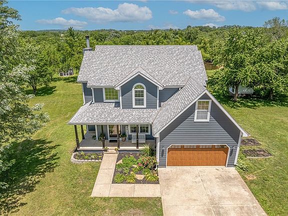 This expansive home in Holden, MO, offers a harmonious blend of comfort and functionality across three floors. The property boasts four bedrooms, including a generous primary suite, and four bathrooms, ensuring ample privacy for all occupants. The layout includes diverse living spaces, with a combined kitchen and living room, a separate living room, an office, and a loft, providing versatility for various lifestyle needs. The home's design emphasizes natural light, with large windows offering picturesque views of the surrounding landscape. Hardwood floors throughout add warmth and elegance, while the modern kitchen features white cabinetry, stainless steel appliances, and subway tile backsplash. Bathrooms are well-appointed with contemporary fixtures and neutral color schemes. Storage solutions are thoughtfully integrated, including built-in shelving and closet space. The property also includes outdoor living areas, with a deck and yard space perfect for relaxation or outdoor enjoyment. This well-designed home provides a perfect balance of shared and private spaces, ideal for family living or hosting guests. Driving into the property is on a paved road.