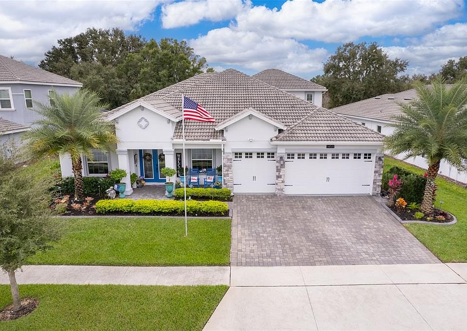 Check out this stunningly upgraded estate home in the Champions Gate Golf Country Club community! The Grande Charleston model exudes a welcoming vibe, boasting a front porch and new French doors. Stepping inside, you're greeted by a spacious foyer, living, and dining area adorned with premium paint and Porcelain tile. The kitchen, to the right, features 42-inch tray wood cabinetry, stainless steel hardware, an oversized quartz island complemented by matching countertops, elegant pendant lighting, LED fixtures, subway backsplash tile, and GE appliances. The cozy family room with sliding doors to the pool deck is perfect for unwinding. On the left wing, discover the executive master bedroom suite with a tray ceiling, sliding doors, two walk in closets, a beautifully tiled bathroom suite with a garden tub, separate shower, and an office/den drenched in natural light with a beautiful built-in library area. The second and third bedrooms share a full hallway bath, while the fourth bedroom connects to another full bath with pool access. The second level features a full bath and a generous loft area, ideal for the perfect home entertainment experience. The laundry room comes equipped with a GE Profile Series washer/dryer, and leads to the 3 car garage with newly laid Epoxy flooring and plenty of room for your cars and golf cart, aswell as additional garage storage and attic addition. Step onto your covered pool deck overlooking the oversized lot, with an oversized spa big enough for ten people, and a large pool stylishly designed by the current owners, complete with LED lighting. There is also an outdoor kitchen area with so much private space to sit and enjoy the stunning outdoor surroundings this gorgeous home has to offer. Upgraded landscaping, irrigation, ceiling fans, stucco elevation, clay tile roof, rain gutters, lighting and much more add to this home's allure. The amenities at the Oasis Clubhouse and Water Park are truly spectacular, featuring a lazy river, water slides, pools for all ages, a spa, restaurants, bars, a theater, games room, fitness center, and cabanas. But wait, there's more! The Country Club boasts a private clubhouse exclusively for primary residents, offering dining, business facilities, pools, a spa, and lounging areas. This energy-efficient, solar powered secure home comes with HOA fees that cover cable, internet, landline telephone, home security, gated community access, lawn care, landscaping, golf membership, clubhouse access, business center usage, and even a monthly restaurant credit. It's a true value for what it offers! Come and see for yourself.