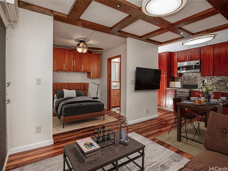 Conveniently located 1 bedroom, 1 bath residence in Queens Villa. This partially renovated unit features new luxury vinyl flooring, updated kitchen cabinets, granite countertops, bathroom vanity and window AC. Relax on your covered lanai or enjoy the neighborhood parks nearby. Comes with one assigned covered parking stall. Minutes from neighborhood parks, Downtown Honolulu, and Queens Hospital.
