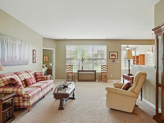 Well-maintained one-owner ranch half-duplex offering 2 bedrooms, 2 baths, and 1,791 square feet of comfortable living space. The home features a welcoming two-story entry, 9-foot ceilings, and neutral flooring and paint throughout. A versatile den/office adds flexibility, while the spacious kitchen includes all appliances. The sunroom, with ceramic tile flooring and walls of windows, brings in abundant natural light and features a sliding glass door leading to a concrete patio-perfect for relaxing or entertaining. The primary bedroom offers a walk-in closet and attached 3/4 bath. Additional highlights include a laundry room with washer and dryer, an attached 2-car garage, a new furnace and A/C installed within the past 2 years, and a roof that's approximately 2 years old. Conveniently located near the Illinois border with low Indiana taxes. HOA covers lawn care and snow removal; monthly fee is 170. Estate sale-being sold as is, but in beautiful condition.